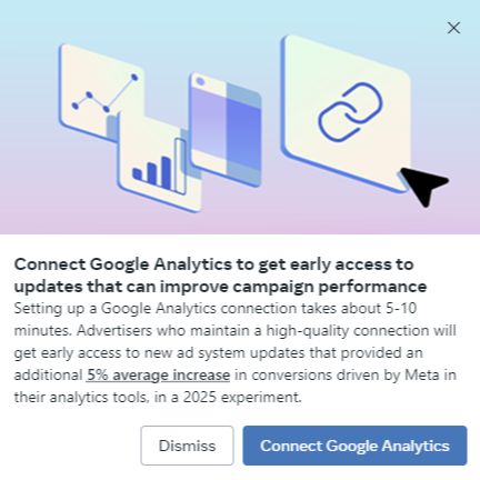 Meta is prompting advertisers to link their Google Analytics data with its platform. Some ad account managers are now seeing a pop-up message in Ads Manager inviting them to integrate Google Analytics with their Meta Ads account.