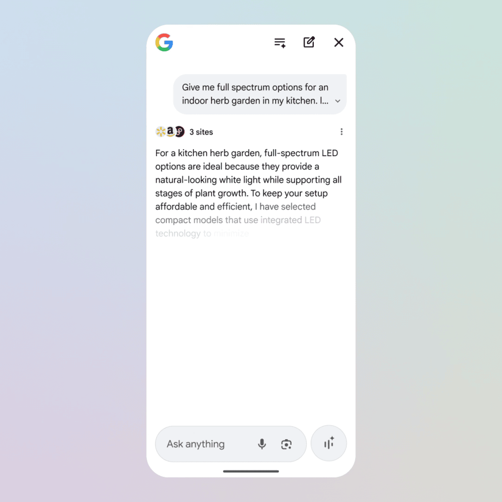 This action reveals an option to ask a follow-up question. When the user submits the question, Google carries over the context of the original query and shifts the interaction into AI Mode. The follow-up keeps the original context and allows the user to focus on a specific detail without starting a new search.