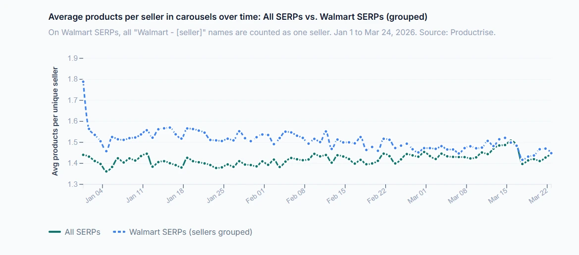 The Productrise study tracked the products-per-seller ratio throughout Q1 2026 and found it fluctuated between 1.36 and 1.51, indicating algorithmic stability. The algorithm is operating as designed. But it counts seller names, not destination domains. Walmart's 1,600+ seller names all resolve to Walmart.com. Google's algorithm does not apply any equivalent correction.